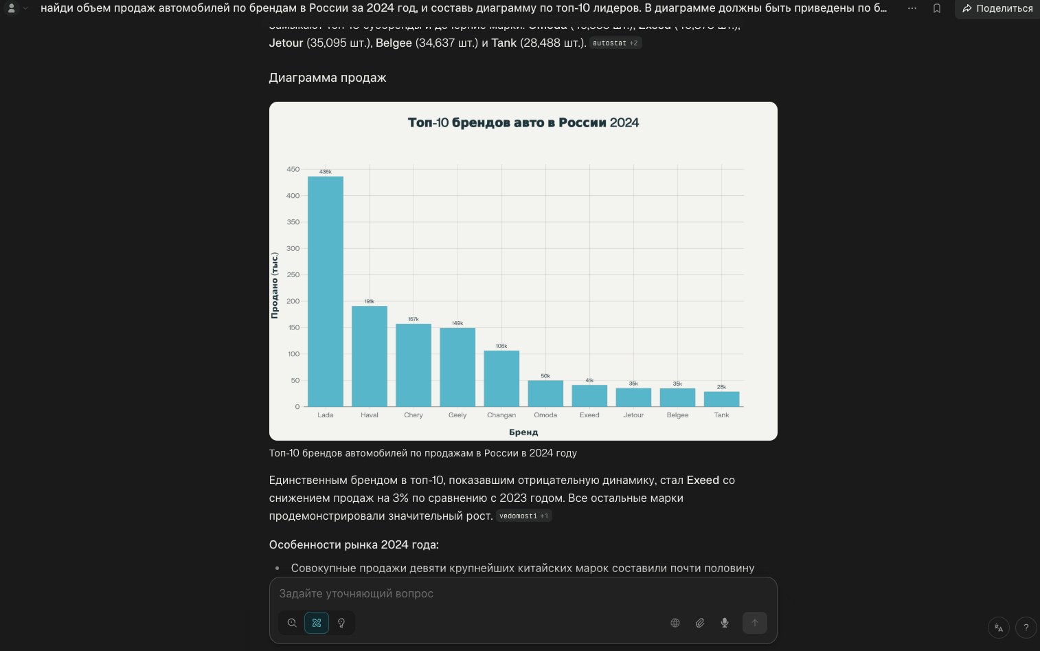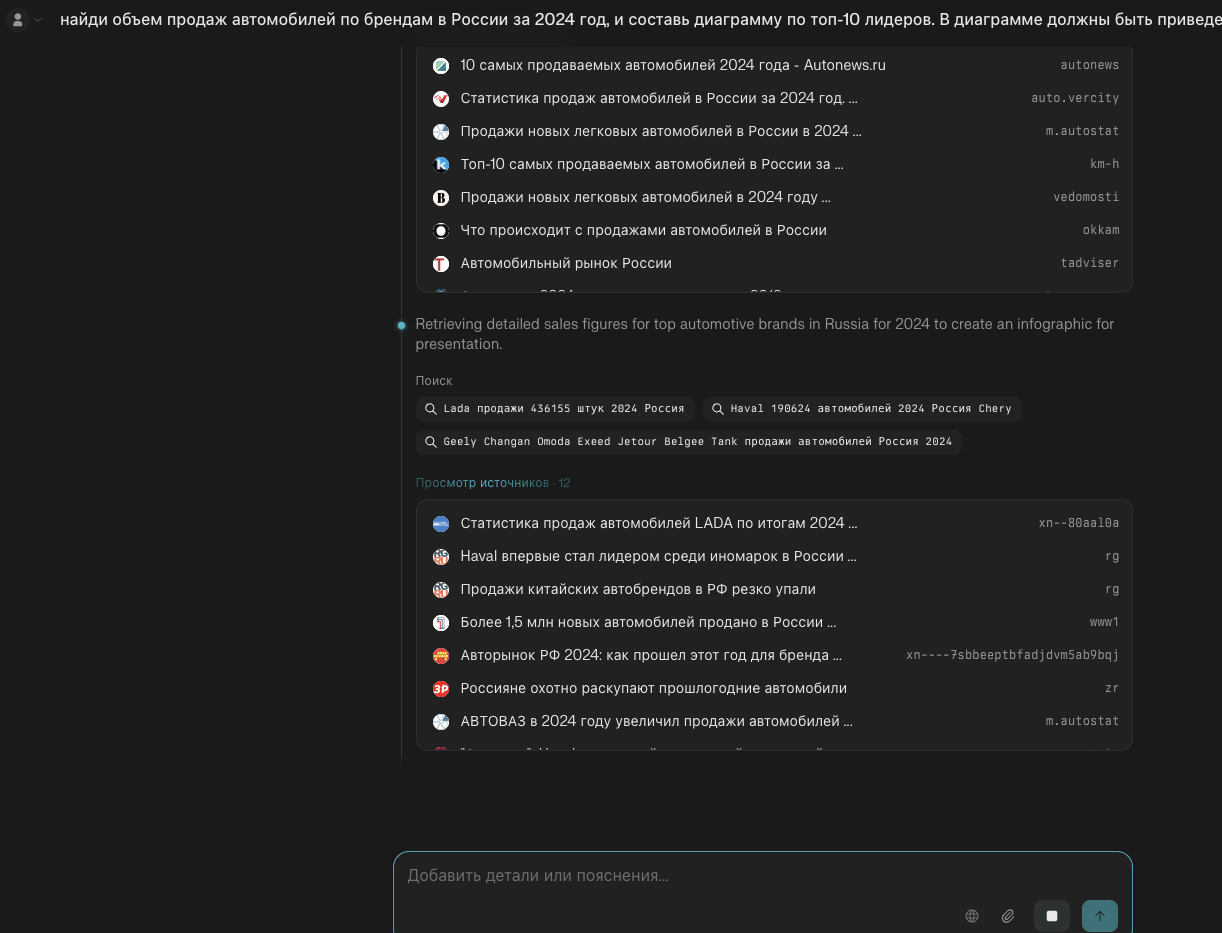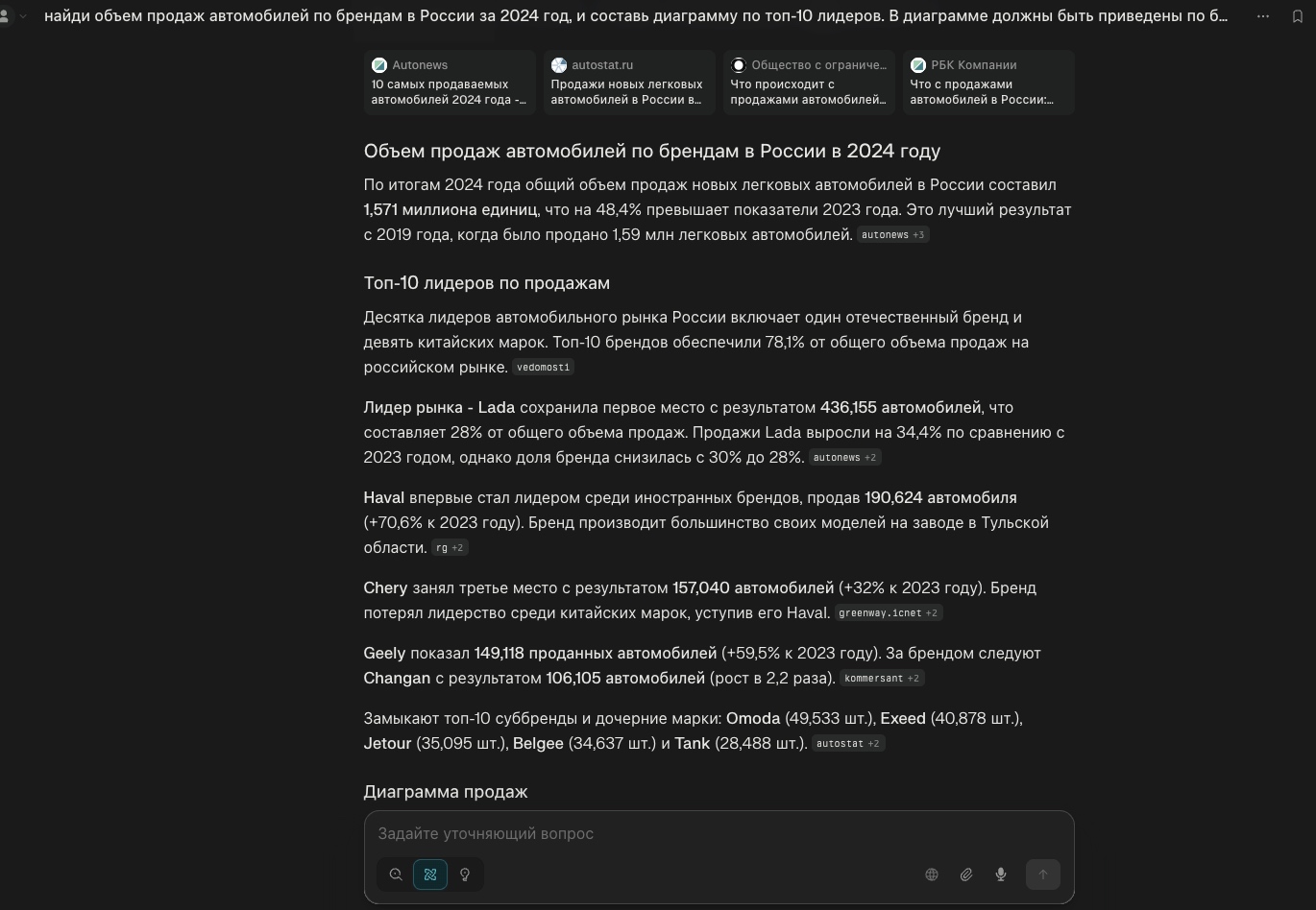 В конечном итоге где-то через две минуты нейросеть дала ответ. Сначала в текстовом виде информация, какой был объем продаж в 2024 году, кто продавался лучше, кто хуже. Все со ссылками на источники.