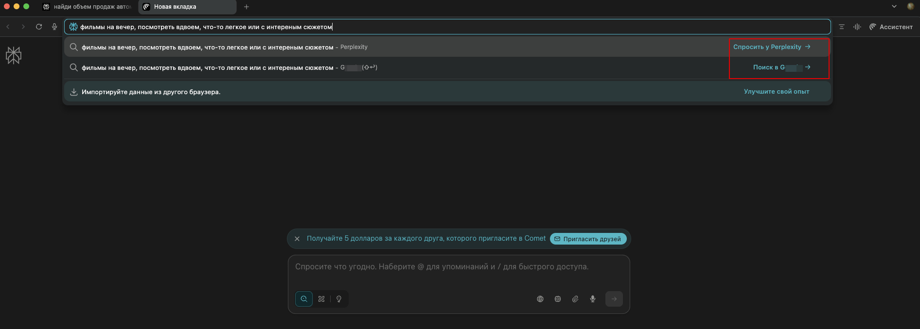 Perplexity предлагает браузер Comet со встроенным собственным ИИ. В целом это примерно также, как в обычном браузере держать открытой вкладку Perplexity. Собственно, когда в Comet пишешь запрос, он тоже предлагает два варианта — спросить это в поисковике, либо спросить это в Перплексити. В целом не увидел особого смысла ставить Comet. Может, его можно приспособить под персонального помощника